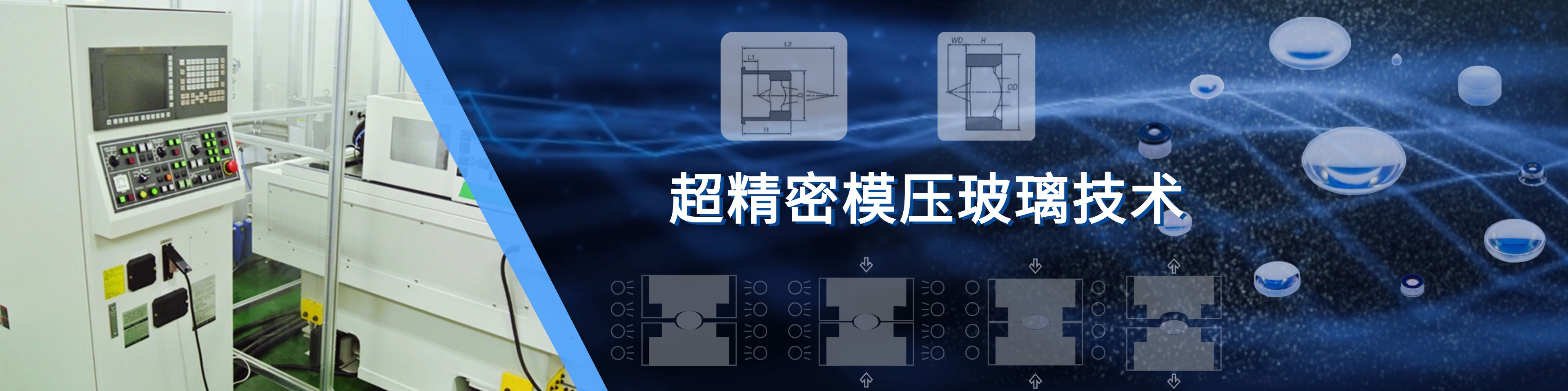 公司经过多年坚持不懈的研发投入,成功攻克了非球面相关技术难题,开发出国内领先的高精度模压玻璃非球面技术。该技术涵盖碳钨合金模具制作、阵列非球面透镜制作、非球管帽制作等多个领域,实现了从模具设计与制作、玻璃模压、精密测试到成品镀膜的自主研发。模具加工设备精度达2nm,钨钢模具面型精度RMS可达10nm,模压产品面型精度RMS可达20nm。